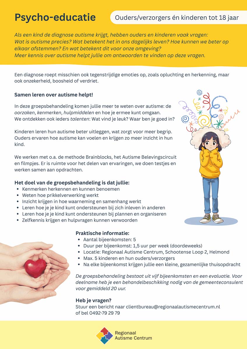In zes bijeenkomsten leren broers en zussen wat autisme betekent voor hun broer of zus en waarom hij of zij soms anders reageert. Ze ontdekken hoe ze hun broer of zus beter kunnen begrijpen én hoe ze goed voor zichzelf kunnen opkomen. De groep helpt hen meer rust, duidelijkheid en begrip te ervaren binnen het gezin.